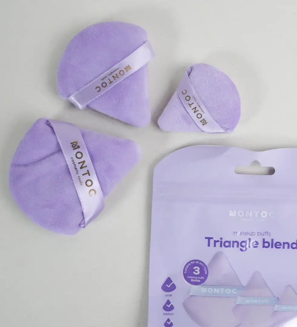 El Set de borlas triangulares es un set de tres borlas triangulares para maquillaje en tamaños grande, mediano y pequeño. Están pensadas para aplicar y sellar polvos sueltos o compactos con precisión y acabado uniforme. Su forma facilita llegar a cada ángulo del rostro, logrando un sellado limpio y profesional sin dejar marcas ni exceso de producto.